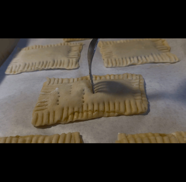 Spoon the preserves onto the bottom pastry, brush egg around the border, and top with another pastry. Use a fork to crimp the pastry pieces together.